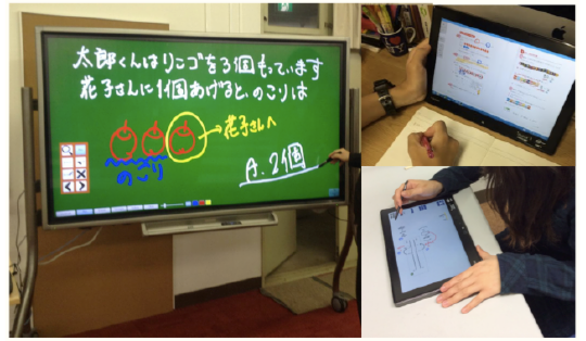 電子黒板と学習者用端末を持つ環境での学習を支援するシステムの研究を進めています.様々な市販システムを調査し,電子黒板上のあらゆる板書を自由に学習者用端末に送れること,児童生徒はいつでも何度でもノートを先生に送ることができることなどを特徴としたシステムを設計しています.