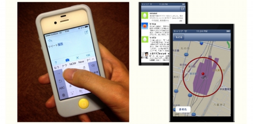 Twitterの仕組みを利用して,ある場所にいる人にメッセージを届けるコミュニケーションツールの研究を進めています.ツイートの際に場所を指定すると,その場所にいる人のタイムラインにツイートが表示されるTwitterクライアントアプリを開発しています.これでどこかに忘れ物をしたときや,これから行くカフェの混雑をまったく知らない人に聞くことも可能になります.