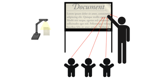 実物投影機の操作では,大型提示装置に写された教科書やプリントを見ながら手元でそれらを動かす操作が難しいことや,操作している教師の場所と表示されている場所が離れていることで児童生徒の視線が分散する,教師と児童生徒の視線が一致しない問題がある.そこでこれらの問題を解消するために,電子黒板上でのタッチ入力によって直接的に実物投影機の操作を可能とするインタフェースの研究を行っています.