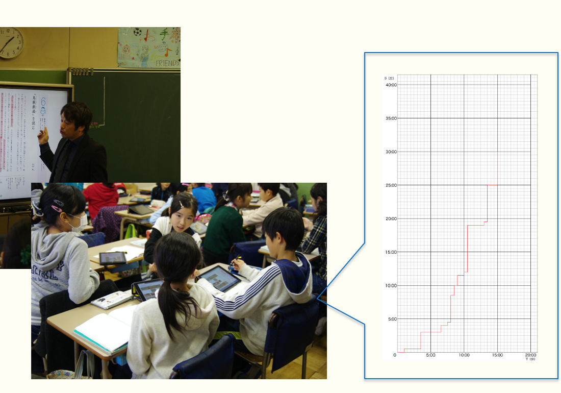 授業映像を基にした授業分析支援システム 授業分析の⼀つの⽅法であるS-T分析は,授業の全体像把握,客観的データによる授業の「⾒える化」等の⾯で有⽤ですが,とても分析にかかる負担が大きい問題があります.そこで,授業映像から自動的にS-Tグラフを自動生成し,そのグラフと同期しての授業映像を閲覧できるシステムを研究しています. |